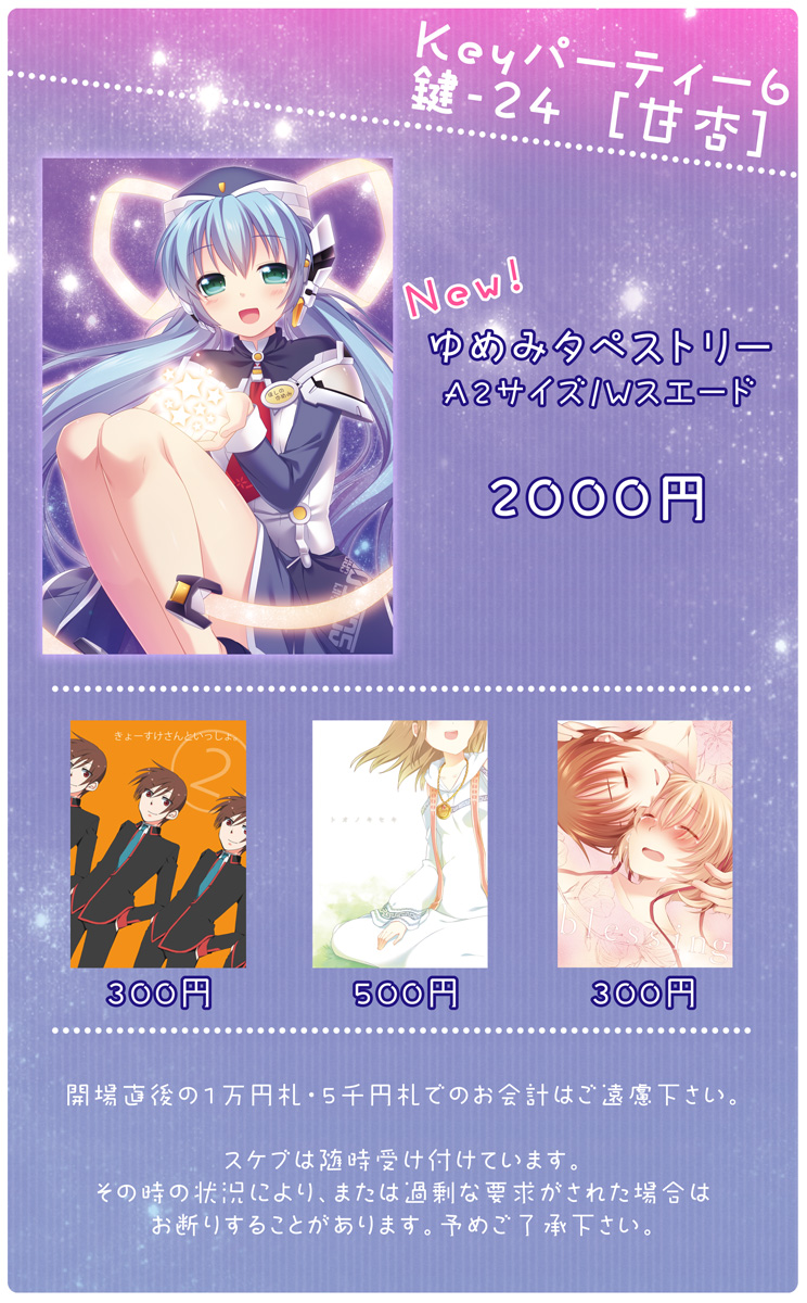新しいものはゆめみのタペストリーです。あとは鍵の既刊ももっていきますー